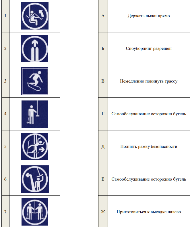 Задание 3. Соотнесите, указательные знаки на горнолыжных комплексах с их обозначением