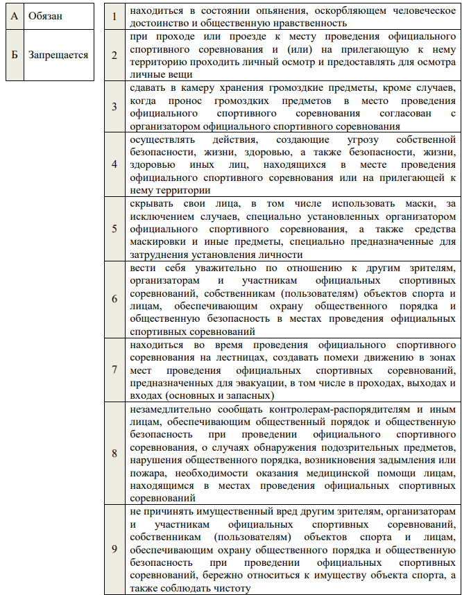 Задание 4. Соотнесите, что зритель обязан делать, и что ему делать запрещается на массовых спортивных мероприятиях. Ответ запишите в таблицу