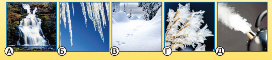 7. Вода может быть в трёх состояниях: жидком, газообразном и твёрдом. На какой картинке вода находится в газообразном состоянии?