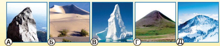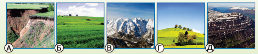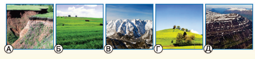 14. Земная поверхность имеет разнообразные и непохожие друг на друга формы. На какой картинке изображён овраг?