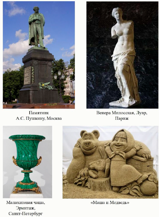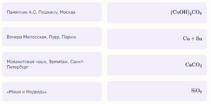 Ответ: Памятник А.С. Пушкину, Москва → Cu + Sn Венера Милосская, Лувр, Париж → CaCO3 Малахитовая чаша, Эрмитаж, Санкт-Петербург → (CuOH)2CO3 «Маша и Медведь» → SiO2