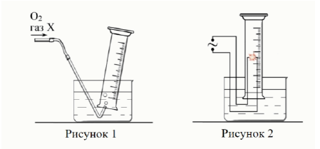 Задание 20. В цилиндре (см. рис. 1) смешали 200 мл кислорода и 100 мл газа X. С помощью электрической искры смесь подожгли (см. рис. 2). Кислород и газ X прореагировали со взрывом без остатка. Продуктами реакции являются только углекислый газ и пары воды. Известно, что X — бинарное соединение, молекулы которого состоят из пяти атомов.