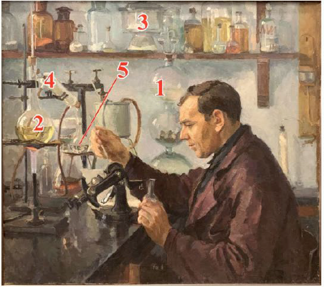 Задание 1. На картине Л.З. Танклевского «Портрет химика Алексея Ивановича Шаврыгина» показано, как учёный измеряет показатель преломления перегоняемой жидкости на рефрактометре. Соотносите названия лабораторной посуды с номерами, которыми она обозначена на рисунке.