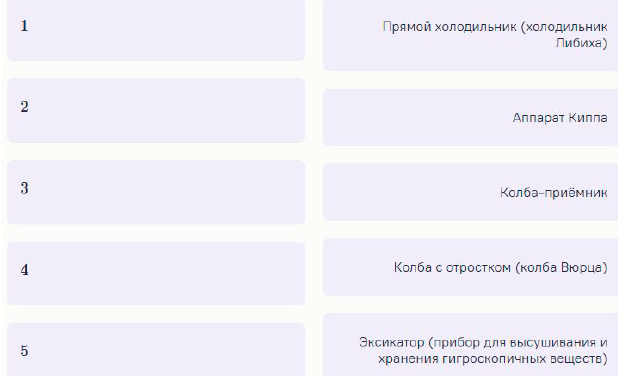 Ответ: 1 — аппарат киппа 2 — колба Вюрца 3 — эксикатор 4 — прямой холодильник 5 — колба-приемник