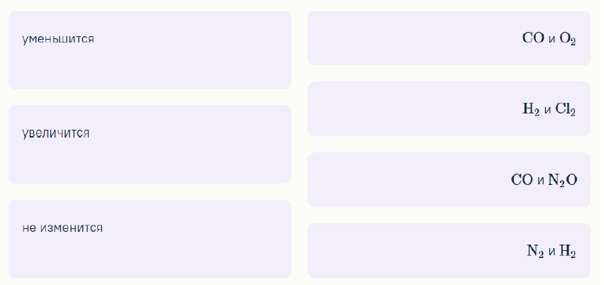 Задание 9. Даны смеси газов (в неизвестных соотношениях). Как изменится средняя молярная масса каждой смеси при протекании реакции между газами? Установите правильное соответствие.