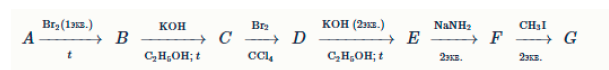 A →[Br₂ (1 экв), t] B →[KOH, C₂H₅OH; t] C →[H₂ (кат.), 2 экв] D →[KOH (2 экв), C₂H₅OH; t] E →[NaNH₂, 2 экв] F →[CH₃I, 2 экв] G