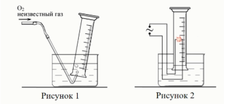 Задание 23. С несколькими газами провели один и тот же эксперимент. Цилиндр наполняли смесью газа с избытком кислорода (рис. 1). С помощью электрической искры смесь поджигали (рис. 2). Неизвестный газ полностью сгорал в кислороде, продуктами реакции являлись только оксид углерода (IV) и пары воды.