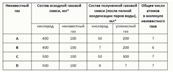Все газы, с которыми проводили этот опыт, являются бинарными соединениями. Вещества A и D – гомологи. Некоторые сведения о результатах экспериментов и составе неизвестных газов приведены в таблице ниже.