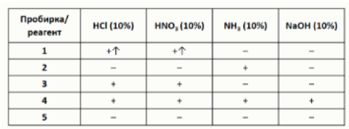 Задание 12. В пяти пронумерованных пробирках находятся твёрдые белые порошки нерастворимых в воде веществ. Чтобы определить содержимое пробирок, с ними провели ряд экспериментов, результаты которых представлены в виде таблицы: