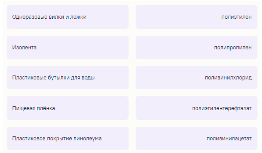 Задание 13. Установите соответствие между предметом и полимером, из которого его изготавливают.