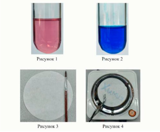 Задание 24-27. Вещество X может растворяться в ацетоне (рис. 1). При добавлении нескольких капель воды окраска раствора меняется (рис. 2). Небольшое количество полученного раствора кисточкой нанесли на фильтровальную бумагу (рис. 3) и полученную бумагу с «невидимой» надписью нагрели на плитке (рис. 4). Таким способом раньше писали зашифрованные послания.