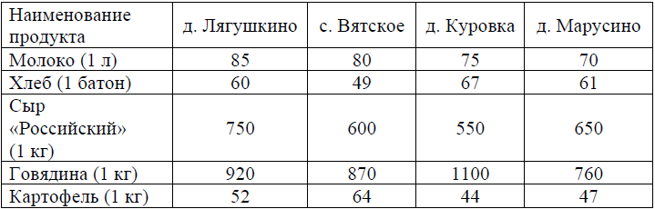 Задание 5. В таблице указана стоимость (в рублях) некоторых продуктов в четырёх магазинах, расположенных в деревне Лягушкино, селе Вятском, деревне Куровке и деревне Марусино.
