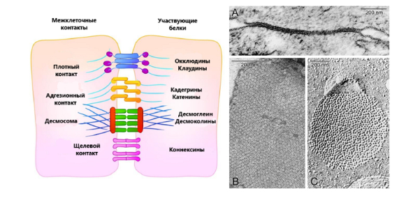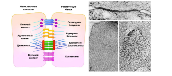 11. В многоклеточных организмах клетки могут быть соединены посредством разнообразных межклеточных контактов (на схеме ниже приведены основные типы контактов, для каждого контакта указаны основные белки, участвующие в его формировании). На фотографии, полученной при помощи электронного микроскопа, запечатлён один из типов клеточных контактов животных. Основными белками, участвующими в формировании показанного клеточного контакта, являются: