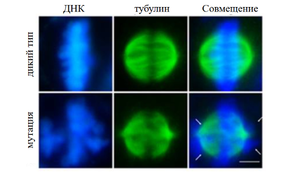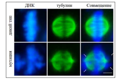 12. На рисунке ниже представлены микрофотографии клеток, окрашенных флуоресцентными красителями на молекулы ДНК (первый столбец) и тубулин (второй столбец). Верхний ряд фотографий показывает клетки дикого типа с нормальным ходом митоза, нижний ряд фотографий показывает клетки с мутацией и нарушением протекания митоза. Укажите, какая стадия митоза показана на фотографиях.