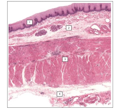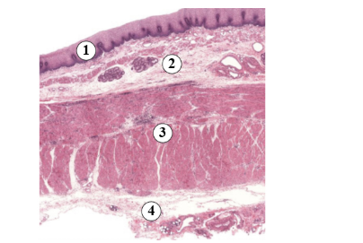 20. Все полые органы человека имеют типичное строение: слизистая, подслизистая основа, мышечный слой и покровный слой (сероза или адвентиция). Перед вами препарат полого органа человека. Укажите цифру, которой обозначена подслизистая основа.