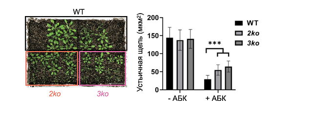 Растения резуховидки Таля дикого типа (со всеми нормально работающими генами, обозначен WT), двойного мутанта по генам миозина XI (обозначен 2ko) и тройного мутанта (обозначен 3ko) выращивали в условиях длительной засухи. Для этих растений измерили площадь устьичной щели при наличии и отсутствии внесённого извне гормона водного стресса − абсцизовой кислоты (АБК). Три звёздочки на столбчатой диаграмме показывают высокую вероятность неслучайного различия параметра между растениями дикого типа и мутантами. Рассмотрите результаты эксперимента и выберите верное утверждение.
