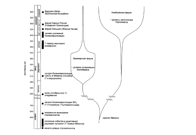 5. Картинка перед вами иллюстрирует начальный этап адаптивной радиации многоклеточных животных. На рисунке слева представлена геологическая шкала времени (в миллионах лет) с отмеченными важными событиями: начало биоминерализации, глобальное оледенение, периоды массовых вымираний, появление эдиакарской фауны и др. Справа показано схематическое «расширение» многообразия животных: от ранних Metazoa к эдиакарской фауне (двуслойный уровень организации) и к кембрийской фауне (трёхслойный уровень организации). Рассмотрите схему и выберите верное утверждение.